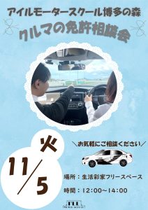 (11月5日)クルマの免許相談会 <アイルモータースクール博多の森> 2024.10.29 以下の日程で、アイルモータースクール博多の森「クルマの免許相談会」を開催いたします。 車の免許取得をご検討の方は、お気軽にお越しください。 【日時】 2024年 11月 5日 (火)12:00~14:00 (上記時間にお越しなれない方はご相談ください。) 【場所】 生活彩家横 フリースペース ♦お気軽にご相談ください!!♦