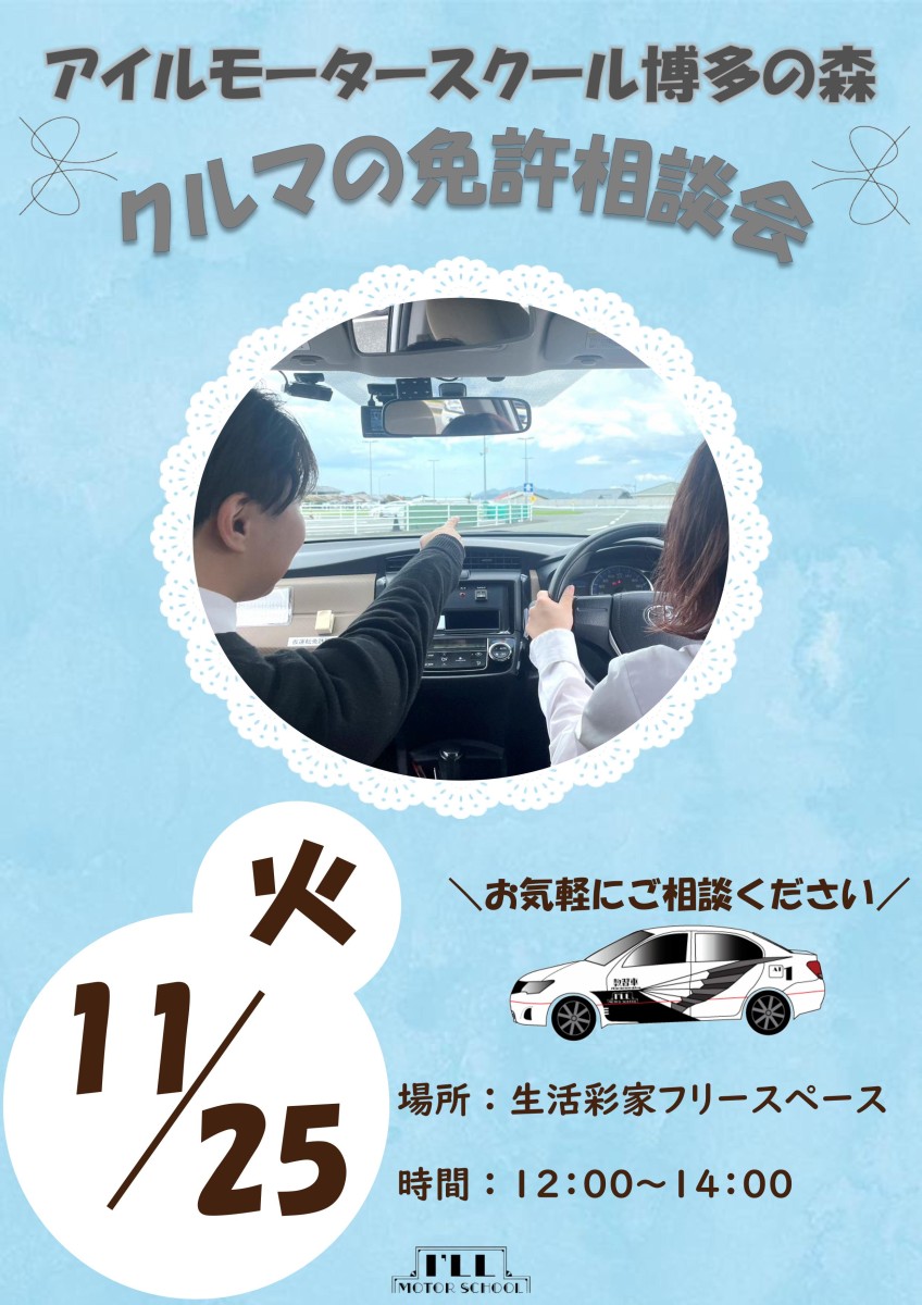 (11月25日)クルマの免許相談会 <アイルモータースクール博多の森> 2025.11.18 以下の日程で、アイルモータースクール博多の森「クルマの免許相談会」を開催いたします。 車の免許取得をご検討の方は、お気軽にお越しください。 【日時】 2025年 11月 25日 (火)12:00~14:00 (上記時間にお越しなれない方はご相談ください。) 【場所】 生活彩家横 フリースペース ♦お気軽にご相談ください!!♦