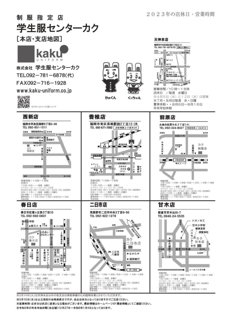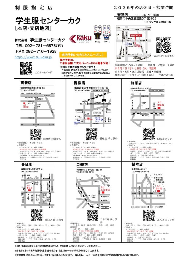 ※株式会社学生服センターカクの本店・各支店でご注文・ご購入お願い致します。◆学生服センターカクの店舗と営業時間は以下の通りです。