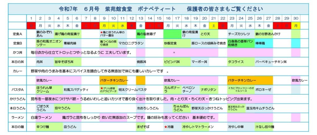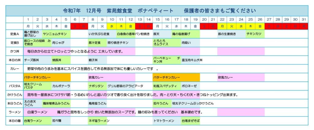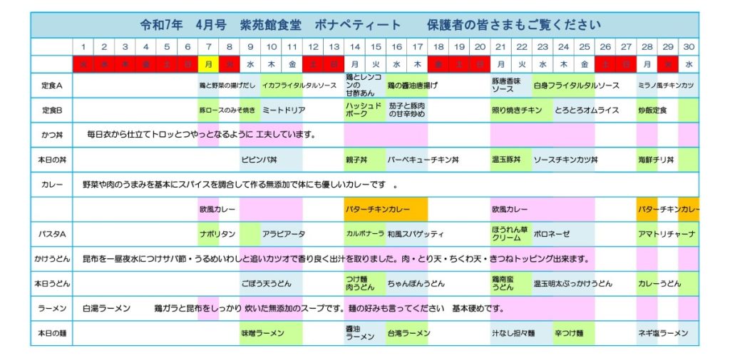 • 成長期のみなさんの体の一部になることをイメージしながら、冷凍食品に頼らず砂糖もできるだけきび糖を使うなど、安全で美味しい料理を提供しています。