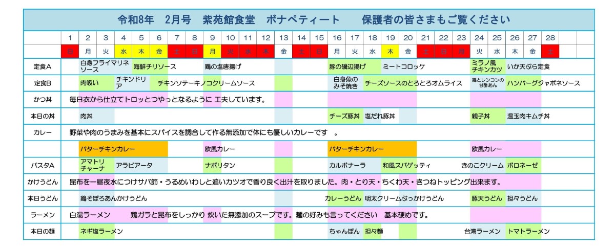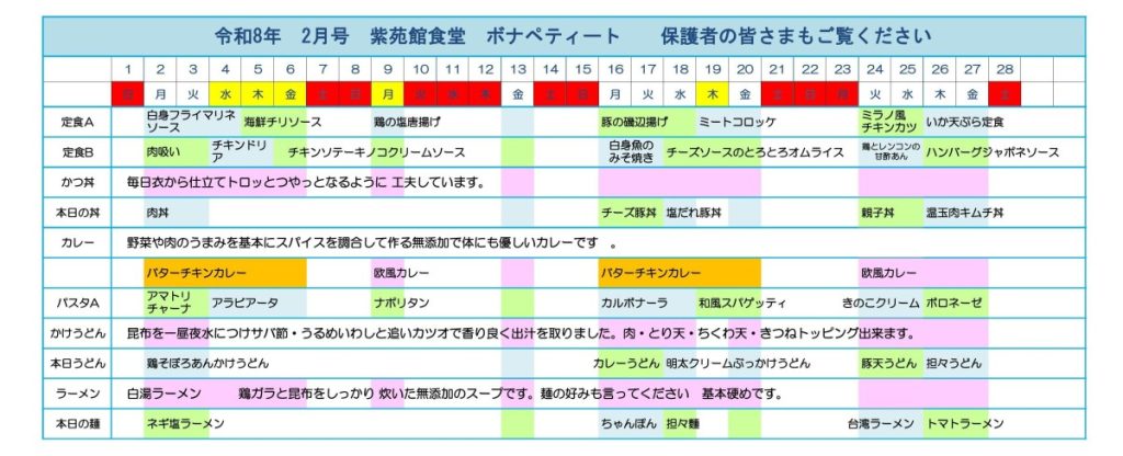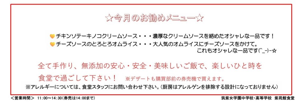 紫苑館食堂の今月のメニューをご紹介します。